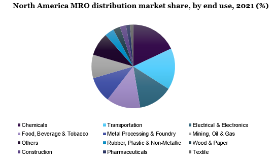 化学制造业最终用途市场领导MRO分销市场,2021年占收入的份额超过18.0%。美国的一个有吸引力的地点操作化学品制造商,与该行业的资本支出飙升21%,2018年达到440亿美元,这得益于市场和趋势预测期预计将继续。的纺织产业预计将产生最小的MRO产品分销商的要求比其他行业最终用途。更复杂的机械和仪器制造过程中使用的组件替代有限的活动。然而,基本的维护和更换机械组件可能会支持MRO的市场分布组件。