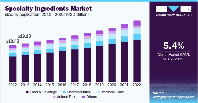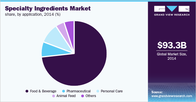 2014年全球特种配料市场规模为933亿美元,预计在预测期内将以5.4%的复合年增长率增长。消费者健康意识的提高推动了对高质量和绿色产品的需求,这反过来又有望推动市场增长。可支配收入的增加,以及由于快速城市化而改变的消费者生活方式,预计将增加食品和饮料、制药、个人护理和动物饲料等各种最终用途行业对特种成分的需求。